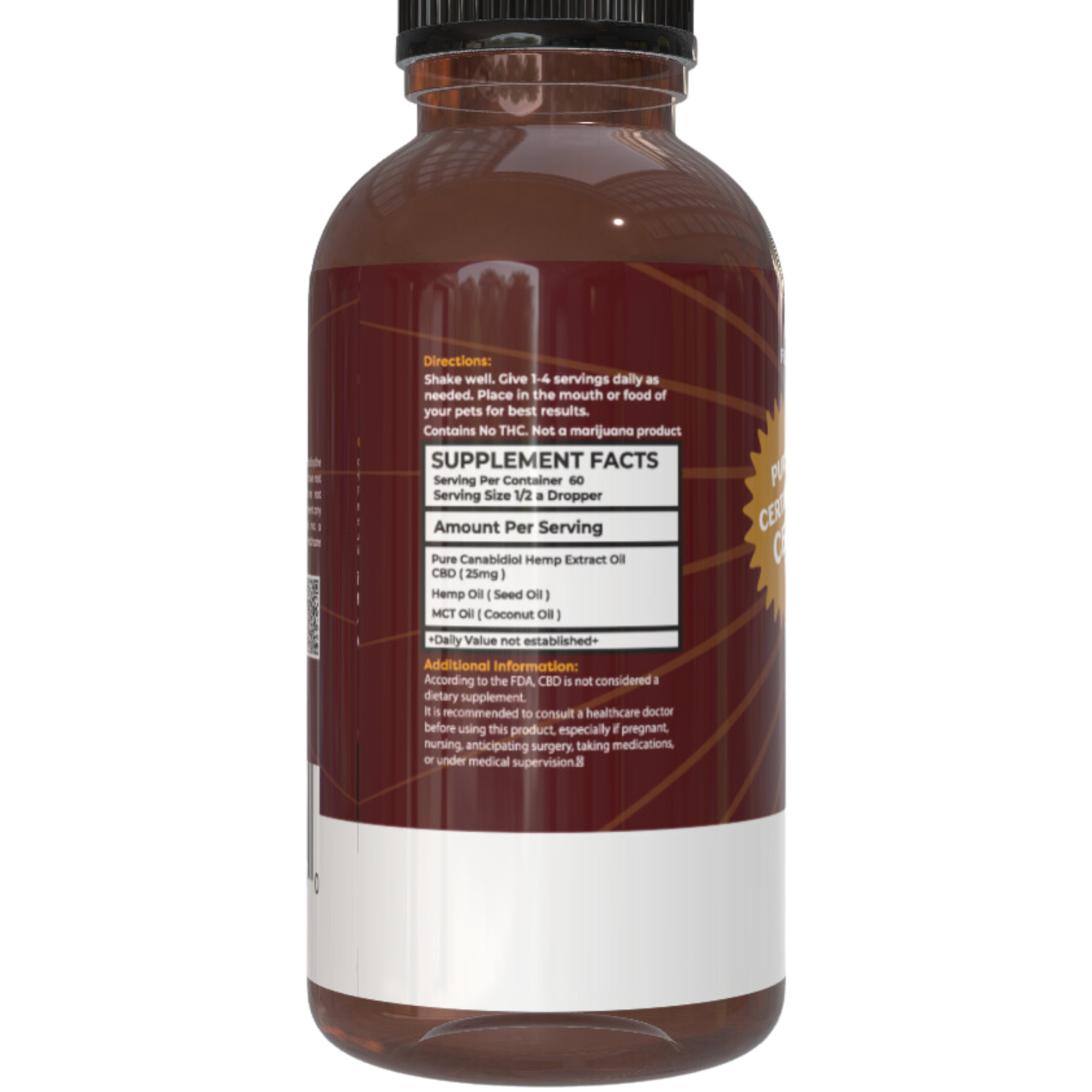 - Pure Cannabidiol Hemp Extract Oil (CBD, 25mg per serving)